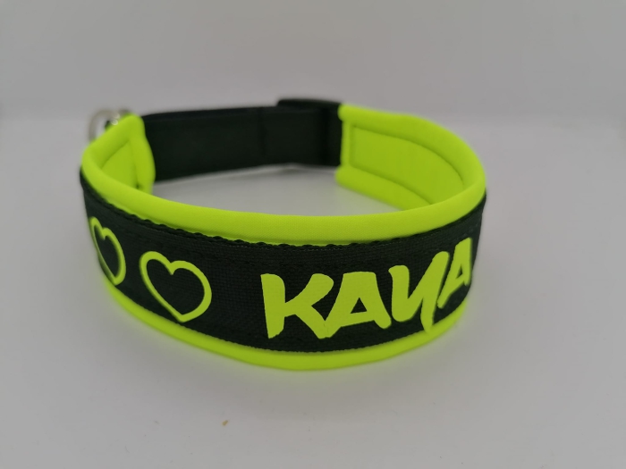 Personalisiertes Hundehalsband schwarz/ gelb mit Softshellpolsterung
